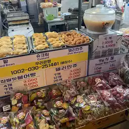 There are so many food options, including sundae (Korean sausage), jokbal (pig's feet), and tteokbokki (stir-fried rice cakes), it's a feast for the eyes. I even bought a flower-patterned kkakkali (sweet rice cake) for my mom!