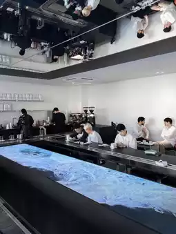 Gwehdo Yeonhui is located on the 1st & 2nd floor with a simple space, the highlight is the LED display "table" with images of waves crashing on the shore as if they were on the sea.
