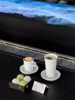 "Injeolmi Cafe" with a creamy cream layer on top and a tteok marshmallow skewer covered with a soy powder layer. Quite a special combination as it's Leon's first time drinking coffee while eating marshmallows tteok