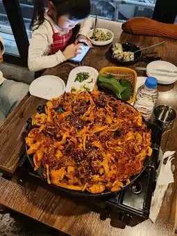 Specialty: Gopchang, available in plain (stewed pork small intestines) and vegetable mix.