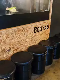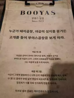 Booyas Gopchang, a Korean restaurant known for spicy stir-fried pork small intestines (gopchang). Key information: