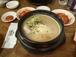 Because they only sell ginseng chicken soup, the waitress simply asked how many people there were and we ordered. In less than ten minutes, the ginseng chicken soup was served, and there were only two side dishes (kimchi & pickled radish). The ginseng chicken soup was served with a small cup of ginseng wine on the side, which could be added according to personal preference. I took a sip before pouring it down. It tasted very strong in ginseng but the spiciness of the alcohol was okay. The chicken was stewed from a whole spring chicken and it tasted very tender. The chicken soup had a strong ginseng flavor, and I filled my stomach with glutinous rice. I was actually very full after eating the whole bowl. The kimchi and pickled radish were quite authentic Korean flavors and they were very delicious.