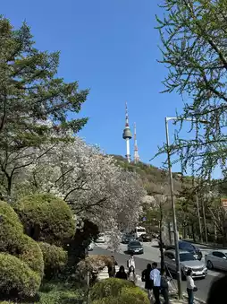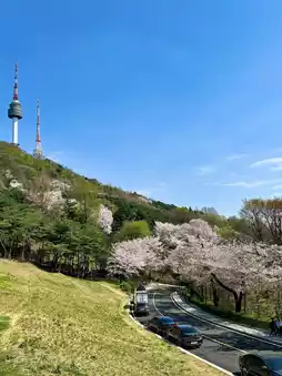 I started from Namsan Park Entrance. The road was really full of cherry blossoms, just like a scene from a Japanese drama. Although it is a bit steep, the scenery along the way is so beautiful that I didn't feel tired while walking. This method is especially recommended because the light in the morning is just right and the photos are beyond the scope of this article.