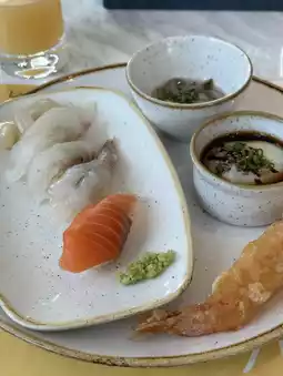 The buffet section was not large, but it featured a Japanese section with 4 kinds of sushi, a live egg section with eggs Benedict, and a noodle section with noodles.
