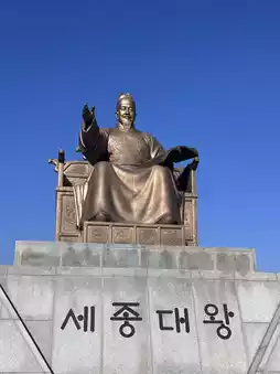 The statue is very large and stands very impressively in the middle. I heard that the whole statue is 6.2 meters high and weighs more than 20 metric tons. It was built in 2009 and designed by a professor at Hongik University. He had a book spread out in his hand, his expression was gentle yet dignified, and he looked very wise and kingly. There are several ancient instruments such as sundial and rain gauge in front of the statue, which has a sense of science and history.