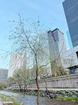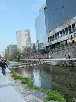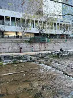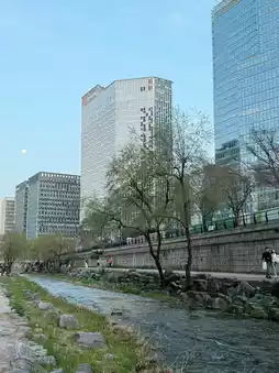 This is Cheonggyecheon Stream in Seoul. The stream stretches so long here, making it a great place for a stroll or just a break! It's a great place to stroll, as it's like the US, with warm sunlight pouring down during the day and the sunset in the evening. The abundance of trees makes this place even more relaxing. And if you sit and relax, the constant sound of water provides a soothing feeling. If you're looking for a relaxing walk in Seoul, I highly recommend this place. There are plenty of restaurants nearby, making it a great place to enjoy a stroll afterward.