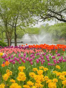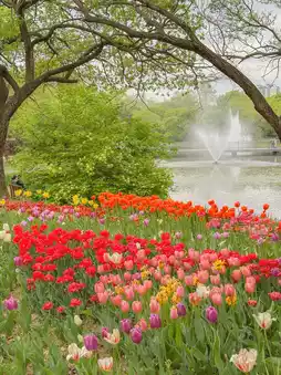 Red, yellow, and pink tulips are in full bloom along the walking path that leads from the central lawn square