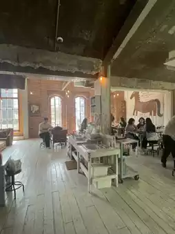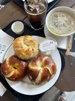 Its sophisticated interior is like that of a London art museum, and its chewy and fragrant authentic bagels are its charms!