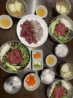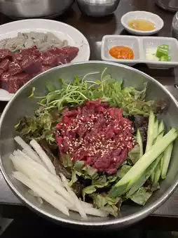 We ordered yukhoe bibimbap and a menu with omasum and liver on one plateโฉ