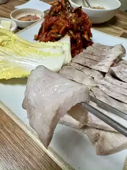 The bossam is very juicy and soft! The Korean cabbage that wraps it is lightly salted, so it's easy to wrap and tastes good