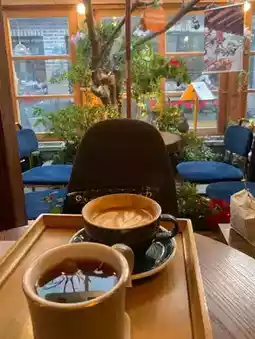 The cafe is beautifully designed, featuring bright interiors adorned with vibrant flowers that create a cozy atmosphere. It’s clear that the owner has a fondness for cats, as adorable cat figurines can be spotted throughout. The design incorporates plenty of greenery, with the standout feature being the magnificent persimmon tree at its center. Unique mug-shaped chairs add an interesting touch to the decor, and there’s a private room available for gatherings, surrounded by the inviting common areas.
