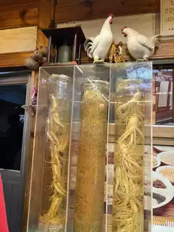 Feature - Ginseng Chicken Soup is a traditional nourishing dish that is made by stuffing ginseng, red dates, glutinous rice and nuts into the stomach of a cleaned young chicken and then stewing it in broth. The soup is thick and the accompanying ginseng wine can increase appetite. Basic side dishes include radish cubes and cabbage.