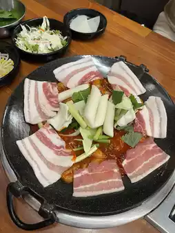 Grilled pork belly served with kimchi, fresh vegetables, and dipping sauces.