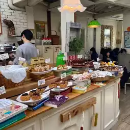 The store is lined with cute animal-themed cakes and colorful sweets that delight the eyes of visitors. Original goods and eco-bags are also sold, making it a great place to choose souvenirs.