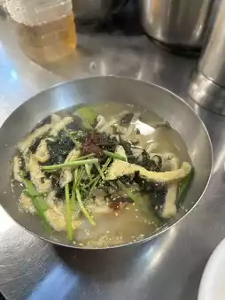 • Kalguksu (칼국수): Handmade fresh noodles, soft and chewy noodles, served in a sweet and fragrant small fish soup. Often topped with fried tofu, seaweed, and sesame seeds.