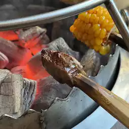 and various vegetables, pineapple, bread, corn, and marshmallows are provided