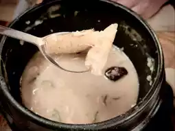 The Samgyetang arrives as a generous, beautiful portion. A whole, plump chicken, tender and perfectly cooked, rests in a milky-white, opaque broth, indicating hours of slow simmering. The aroma is a captivating blend of earthy ginseng, sweet jujube, and aromatic garlic. The chicken, stuffed with glutinous rice, is substantial and falls effortlessly off the bone, the rice having absorbed all the rich flavors. Every spoonful of the nourishing broth is deeply comforting and revitalizing.