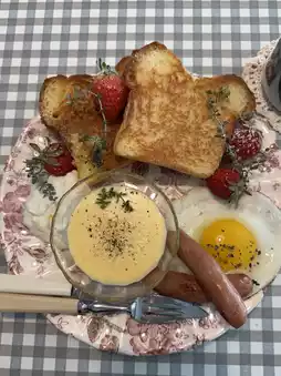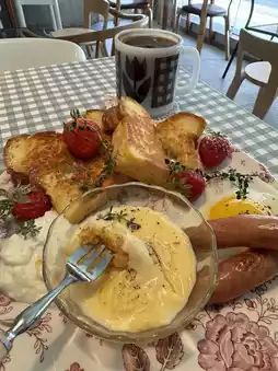 A brunch set featuring freshly baked brioche, cheese sauce, a sunny-side-up egg, sausage, kaymak, and strawberries.