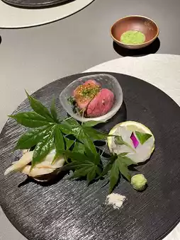 • Ma somen with dashi jelly, charcoal-grilled abalone with butter
