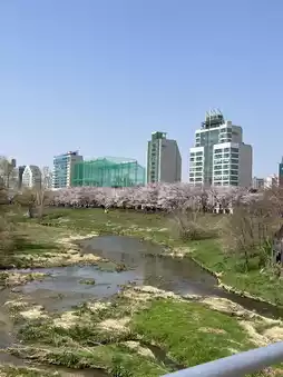 A peaceful urban retreat where you can fully embrace spring while walking along paths adorned with fluttering cherry blossom petals.