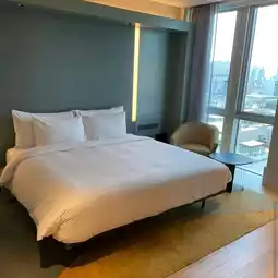 From the floor-to-ceiling windows by the pool, guests can enjoy stunning views of the Gangnam cityscape, offering a futuristic urban experience. Guests frequently describe the pool as "one of the most atmospheric indoor pool designs." The hotel is also highly praised for its exceptional service, including quick check-in, personalized concierge assistance, and a chic bar.