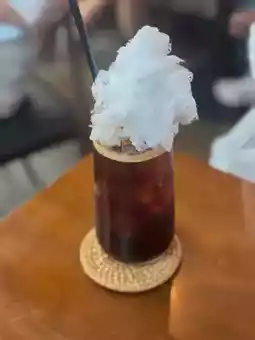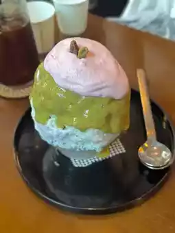 I had the pistachio raspberry bingsu and caramel bingsu, and I highly recommend them. If you order an Americano, they put cotton candy-like ice on top, so it feels even cooler.