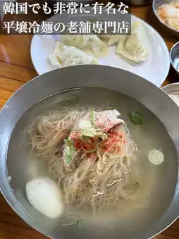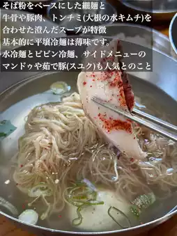 This restaurant is Pyongyang Cold Noodles, and its characteristics are thin noodles based on buckwheat flour and a clear soup made with beef bones, pork, and tongchimi (radish water kimchi).