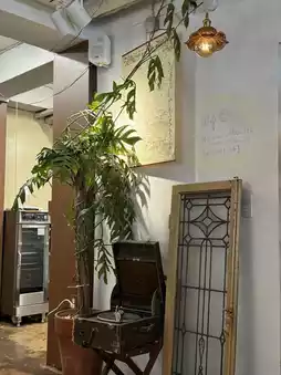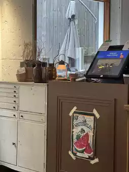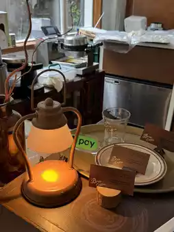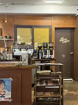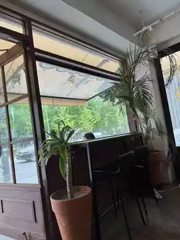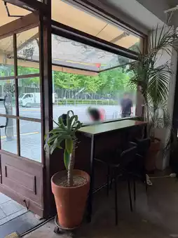 This cafe features a warm, wood-toned interior and a bright, sunny atmosphere.✨