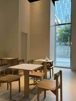 The interior is bright and clean, and the wood-grain furniture and natural light from the large windows give it an open feel ✨