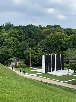 Beyond the fortress, you can see Seoul Sky and Lotte Tower, while turning your gaze reveals expansive lawns and a lake, creating a diverse and picturesque landscape. The surroundings also feature numerous sculptures and outdoor exhibits, naturally catching your attention as you stroll through the park.🌳