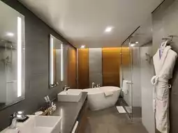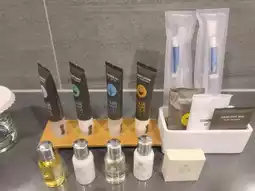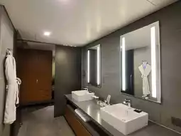 The bathroom amenities included standard Novotel items, with Molton Brown products added for the suite. Since one side of the bathroom is a full-length window, it can feel quite cold.