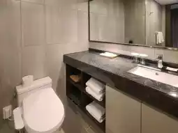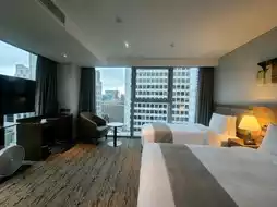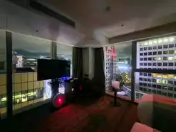The corner-side room features floor-to-ceiling windows, offering a wide view despite being surrounded by buildings. You can spot nearby hotels, Namsan Seoul Tower, and Lotte World Tower. However, the proximity to Ibis Hotel means curtains need to be drawn for privacy. 🤣 The bathroom is spacious, with a large bathtub and shower.