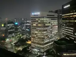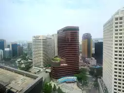 The room offers a "Samsung view," directly facing the former Samsung headquarters. While Namdaemun is obscured by the building in front, Seoul Station is visible from the room.