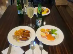 I serve sparkling wine, beer, and Kahlua milk along with prepared food. There are buffalo wings, salmon salad, assorted cheese, fried rice, and pork bulgogi on the menu.