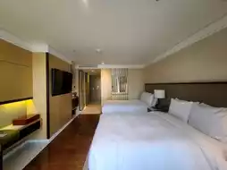 The deluxe twin room has two double beds, so it's spacious, and there's also a table, a study area, and a full-length mirror. 😎