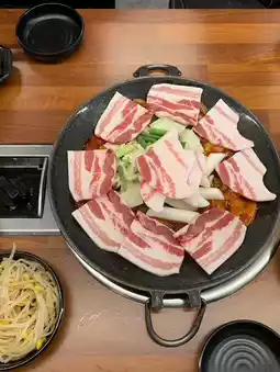 The squid is so fresh, chewy, and not tough at all. It's cut into bite-sized pieces, so you don't have to strain your jaw. It's truly amazing. The pork belly is perfectly fatty and not too greasy. There are also plenty of vegetables on the side, which helps cut through the richness.