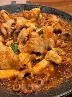 Oh my gosh, their sauce isn't just spicy; it's also a little sweet and salty. It's so creamy, like the sauce has evenly coated everything in the pork belly and jukumi squid.