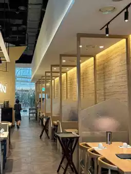 • The interior is clean and resembles a traditional Korean dining space, offering both private dining areas and open seating options.