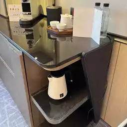 In front of the bed, there's a TV, and to its left, you'll find a coffee machine and a refrigerator.
