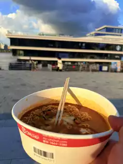 Ramen comes with a cooking bowl, priced slightly higher than regular convenience stores. Outside, there are six self-service ramen cooking machines. On the second floor, BBQ Chicken has limited seating, requiring at least a 30-minute wait to get a table before ordering. The upside is enjoying fried chicken and beer in air-conditioned comfort while saying hello to the Han River bus cruise. The area also features a mini ramen photo wall, making the ramen-eating experience both romantic and upscale.