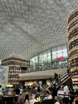 The Starfield Library is located at the heart of COEX Mall, one of Asia's largest underground shopping centers. Its towering 13-meter-high book wall is breathtaking, with natural light streaming in during the day and warm lighting creating a cosmic ambiance at night. The library features comfortable sofas, reading areas, digital screens, and an open design that allows free access, blending shopping, art, and reading seamlessly.