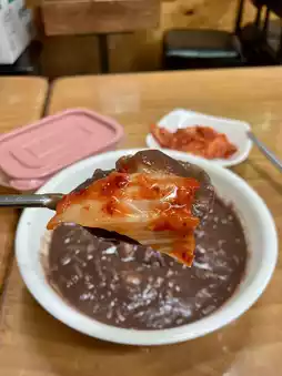 The red bean porridge and kimchi are a perfect match♡The addition of rice flour dumplings makes it super satisfying🫶
