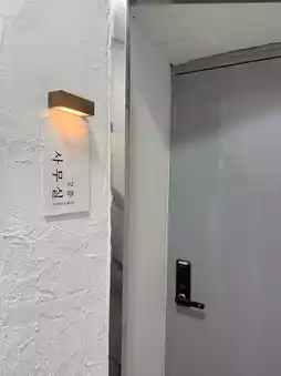 4. "2층 사무실" sign – Simple background, take a photo with a drink