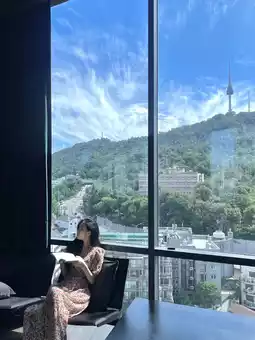 Whether you're sitting alone with a book or laptop, or chatting with friends, the comfortable seating arrangement and well-spaced tables make it an inviting space. The moment the sunset paints Namsan in hues of gold is nothing short of a 'breathtaking view' experience.