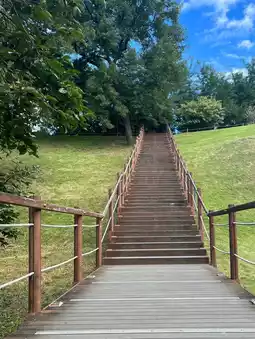 The park stretches across wide open fields, wooded areas, and peaceful lakes, all framed by modern stadiums and sculptures. Its size and thoughtful design give it a dual character: a vibrant hub for events and a tranquil retreat where locals and visitors stroll, cycle, or picnic.