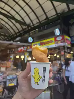 I visited Gwangjang Market for a food tour. Right at the entrance, there was a long line, and it turned out to be for the famous 'Glutinous Rice Twisted Donuts.' I immediately joined the queue. The line extended all the way outside the market, but since it was for takeout, it moved quickly. The taste of the twisted donuts, which I had high expectations for due to the long line, was amazing! The sweet sugar coating and chewy glutinous rice texture were absolutely delicious. They were freshly made, which made them even better.