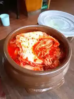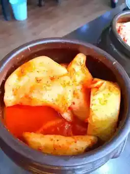 the daikon radish and cabbage kimchi is placed on the table.