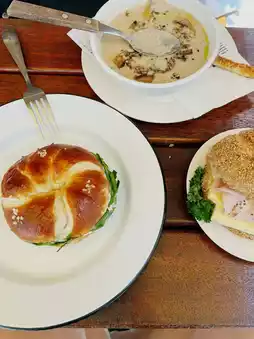 My friend, who prefers a sweeter bagel, chose the one with lemon cream filling. The tart aroma was like a refreshing greeting, pushing back the fatigue of travel. Between bagels, we ordered the shop's famous soup and salad: the mushroom soup was so thick it seemed to be in slow motion on the tongue, and it felt even more comfortable when spread on the accompanying bread. The salad, brightened by fresh leafy greens and sweet peas, evoked a rhythm of "fat and lightness." I particularly like this arrangement: salty and sweet, light and heavy, it's like splitting a day of travel in two, each finding its own balance.