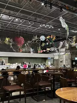 The spacious, high ceilings ensured a comfortable atmosphere. Artwork along one wall and lighting filled the space, creating a warm atmosphere. The ample spacing between tables made it ideal for working on a laptop or simply reading a book.