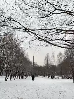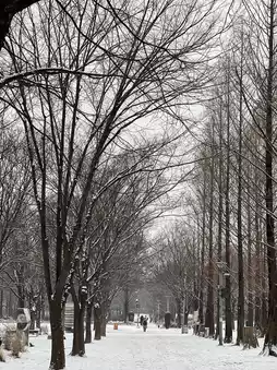 Most of the trees have shed their leaves, leaving behind bare branches gently covered in snow. The sight is poetic, almost like a scene from a movie.